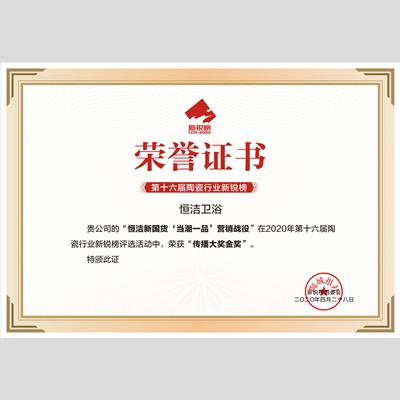 獎 項:2019年度最佳合作伙伴——恒潔衛浴