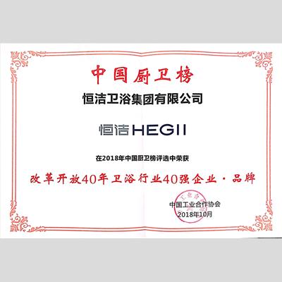 獎 項:改革開放40年衛浴行業40強企業·品牌