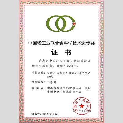 獎(jiǎng) 項(xiàng):中國輕工業(yè)聯(lián)合會科學(xué)技術(shù)進(jìn)步獎(jiǎng)(項(xiàng)目名稱:節(jié)能環(huán)保智能坐便器的研發(fā)及產(chǎn)業(yè)化)