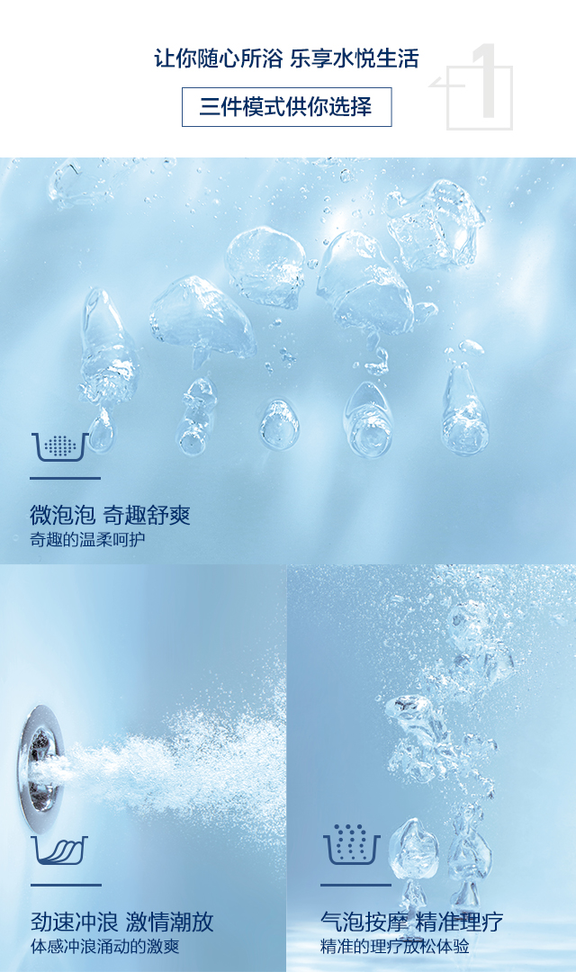 水療獨立按摩系統、勁速沖浪按摩系統、微泡泡按摩系統及汽泡按摩系統三件模式供你選擇,讓你隨心所浴,樂享水悅生活